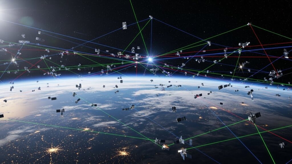 Imagine que você está no meio do Oceano Atlântico. Não tem antena terrestre por perto para receber o sinal. O que o seu satélite faz? Ele dispara um laser para o satélite vizinho, que dispara para outro, criando uma “ponte de luz” no espaço até encontrar uma estação em terra firme.