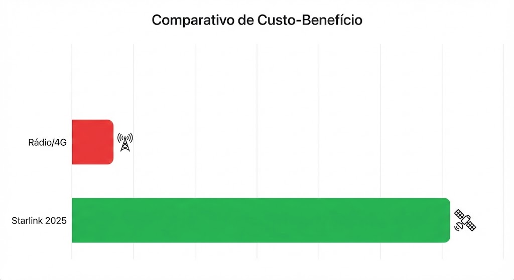 A grande pergunta não é mais “Será que funciona?”, mas sim: “Com os preços atuais, faz sentido eu sair do meu rádio/4G e ir para o espaço?”.